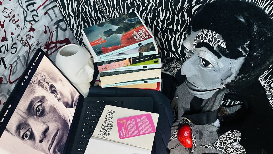 A life sized puppet of James Baldwin and a puppeteer along with other puppets and shadow puppetry enact what happens when love and self- knowledge are made impossible.